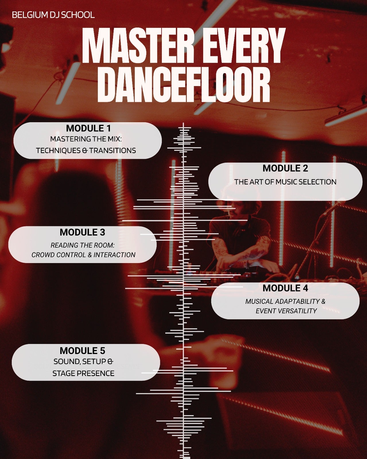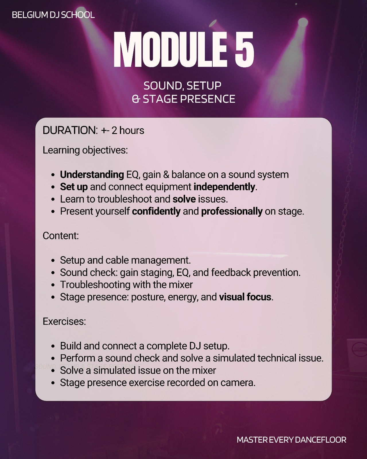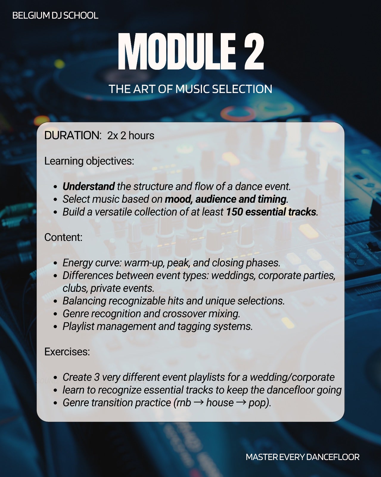 Module 5: Sound Setup and Stage Presence Gain confidence in setting up and connecting your gear, fine tuning your sound, doing a clear soundcheck and solving issues when something unexpected happens. You also learn how to present yourself on stage with a calm and professional presence. This course gives you a complete and enjoyable path into the world of all round DJ’ing, so you can walk into any event with trust in your own skills.