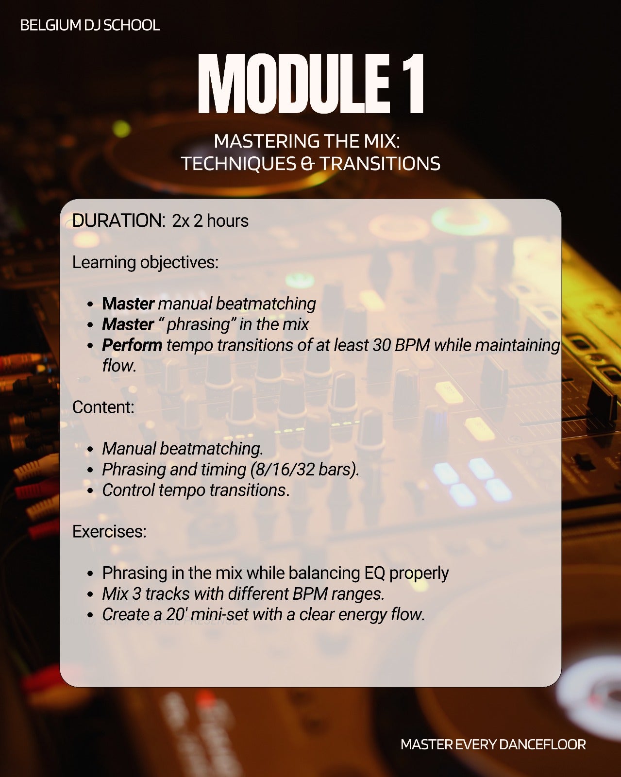 Module 1: Transitions and Techniques Learn how to move from one track to another with the control and flow of a professional all round DJ.