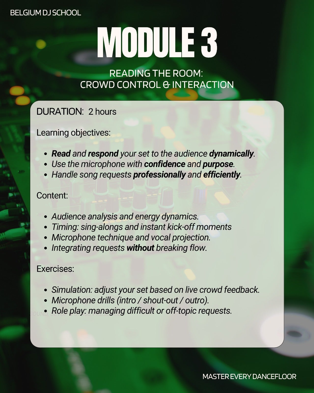 Module 3: Reading the Room Understand how to follow the energy in the room, keep people dancing throughout the evening and use the microphone in a comfortable way.