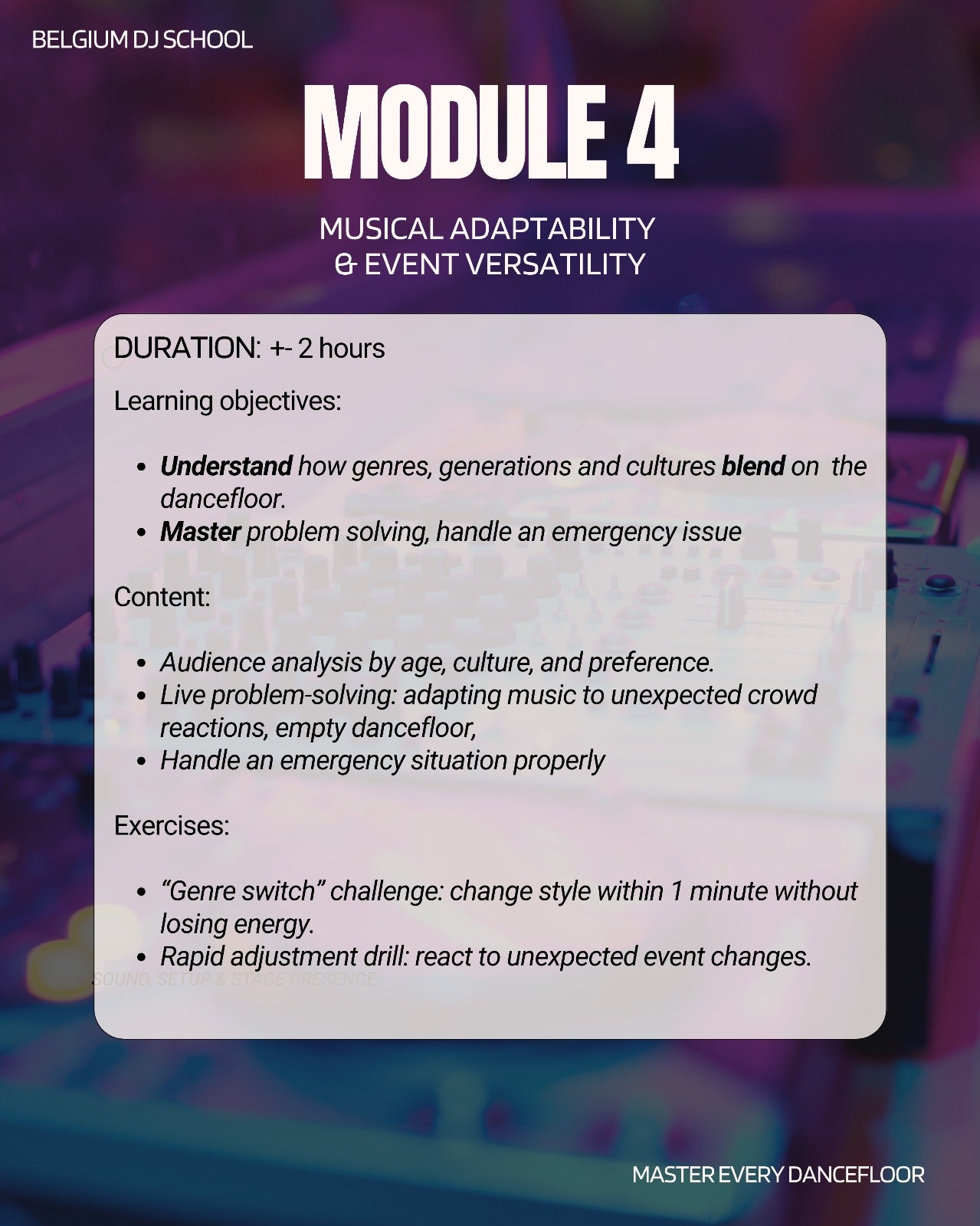 Module 4: Genre Switch Master the skill of changing styles within a minute while keeping the energy steady on the dancefloor. Learn how to adapt to the event and the crowd in front of you.
